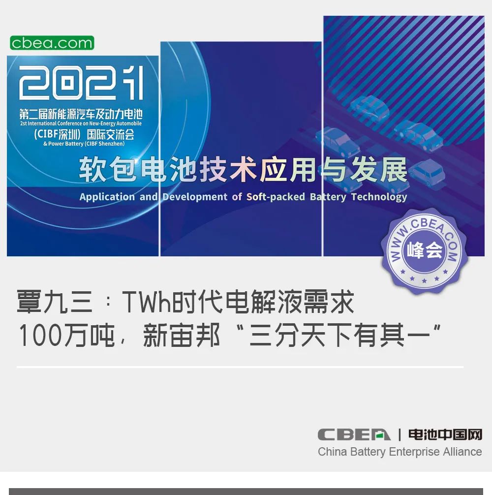 日前,“第二屆新能源汽車及動力電池(CIBF2021深圳)國際交流會”在深圳舉行,在風帆有限責任公司冠名的“軟包電池核心材料及先進技術突破”專場論壇上,深圳新宙邦科技股份有限公司董事長覃九三發表了主題為《新型電解質布局及思考》的演講。