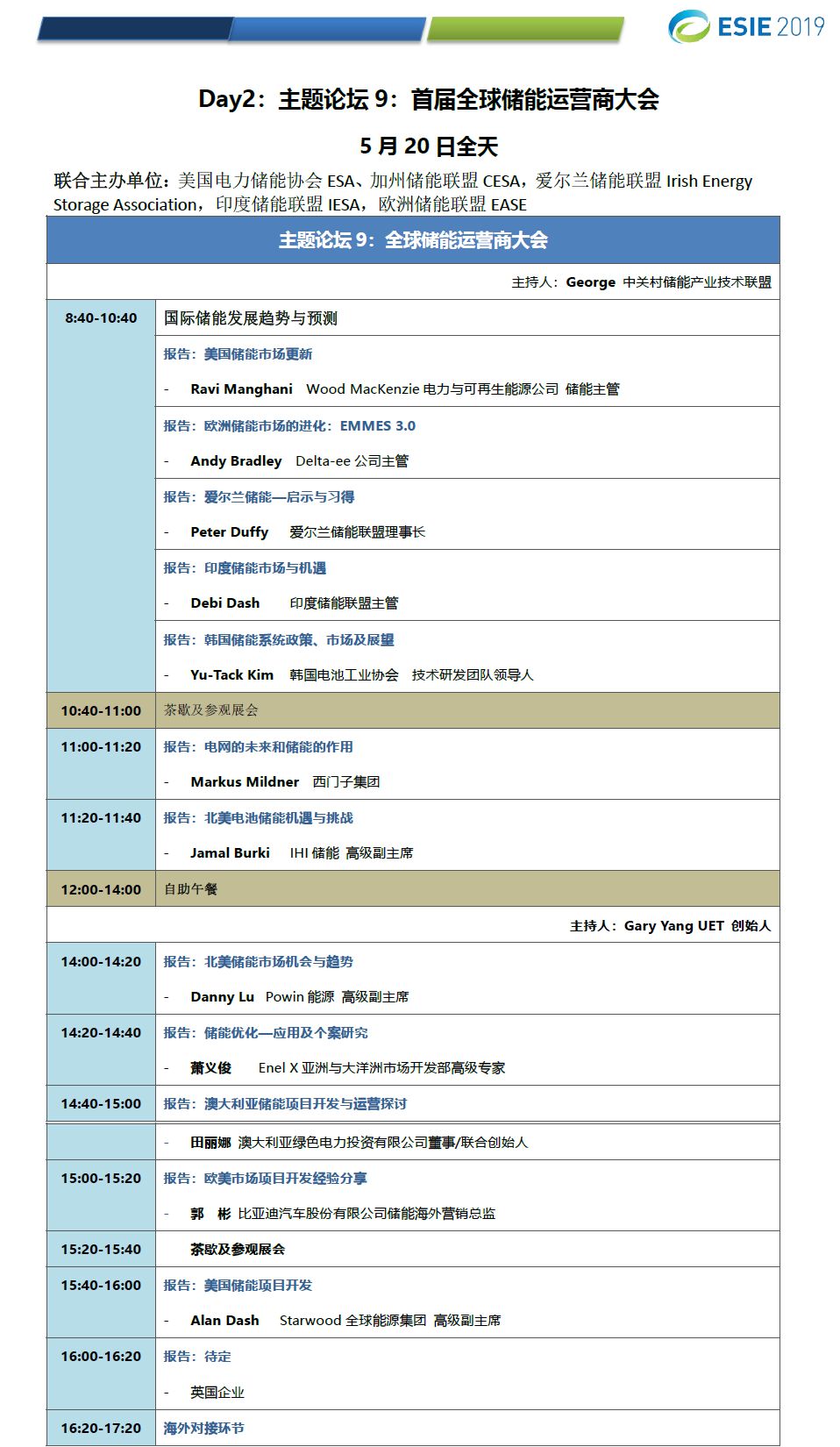 在今年的ESIE2019展會上,與儲能國際峰會同期舉辦的還有2場國際論壇:“首屆全球儲能運營商大會”和“首屆世界儲能技術大會”,超過30個國家的學術專家、政府官員、官方協會、能源開發商和儲能系統集成商,交流儲能技術創新,解讀國際最新能源政策和市場機遇,同時也將同與會的中國企業進行現場的交流和對接。