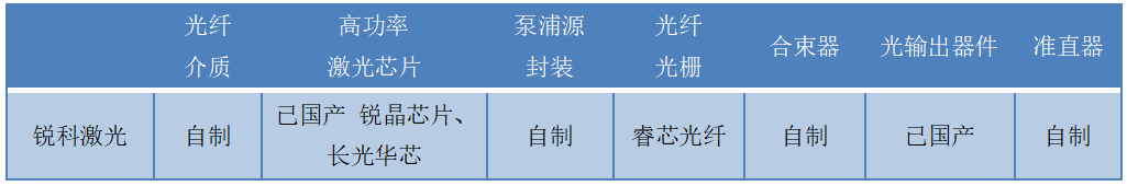 “缺芯”之痛,成為警示,而泵浦源芯片與特種光纖屬于產(chǎn)業(yè)鏈上的“卡脖子”環(huán)節(jié)。在激光芯片方面,銳科激光已通過銳晶激光、長光華芯實現(xiàn)國產(chǎn)化。其中,銳晶激光由中國航天三江集團(tuán)有限公司間接控股,其中武漢光谷航天三江激光產(chǎn)業(yè)技術(shù)研究院有限公司持股51%,而中國航天三江集團(tuán)有限公司也持有銳科激光33.68%的股份。在特種光纖方面,則通過收購武漢睿芯特種光纖有限責(zé)任公司(以下簡稱“睿芯光纖”)實現(xiàn)了垂直整合。