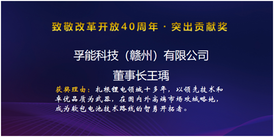 “致敬改革開放40周年-突出貢獻”獎,由天津捷威動力工業有限公司董事長郭春泰、寧德時代新能源科技有限公司董事長曾毓群、天津力神電池股份有限公司董事長秦興才、孚能科技(贛州)有限公司董事長王瑀、江蘇長園華盛新能源材料有限公司董事長沈錦良、深圳市贏合科技股份有限公司董事長王維東獲得。