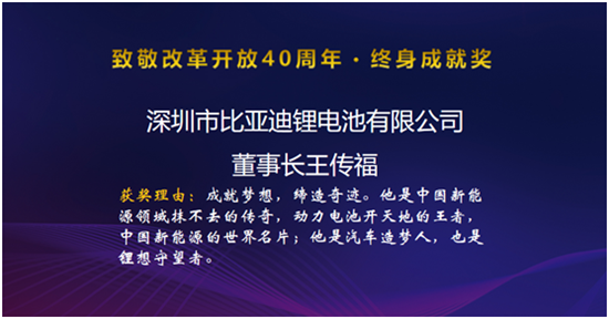 最重磅的“致敬改革開放40周年-終身成就”獎項頒發給了中國船舶重工集團動力股份有限公司總經理劉寶生和深圳市比亞迪鋰電池有限公司董事長王傳福。