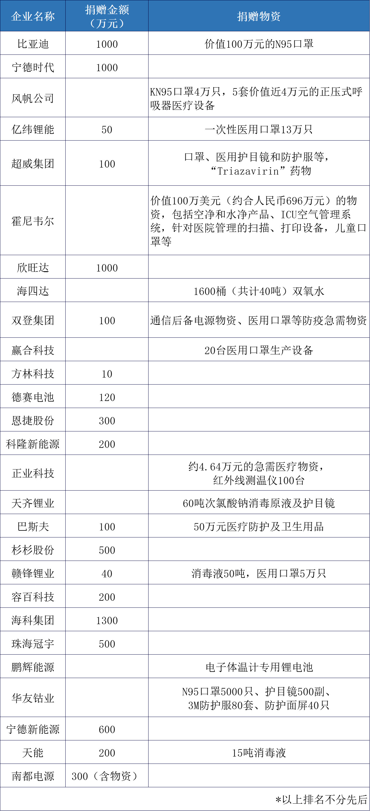 1月28日,比亞迪通過(guò)比亞迪慈善基金會(huì)向湖北省慈善總會(huì)捐贈(zèng)愛(ài)心資金人民幣1000萬(wàn)元,用于支持防控新型冠狀病毒感染肺炎疫情。1月31日,比亞迪海外分公司發(fā)揮其駐地優(yōu)勢(shì),協(xié)調(diào)國(guó)外資源,采購(gòu)價(jià)值100萬(wàn)元的疫情防控物資N95口罩,為奮戰(zhàn)在抗擊疫情第一線(xiàn)的人員提供支持。1月27日,寧德時(shí)代向湖北省紅十字會(huì)捐款1000萬(wàn)元,善款將由疫情防控指揮部統(tǒng)一調(diào)配使用,全部用于疫情地區(qū)前線(xiàn)抗擊以及防治工作。近日,風(fēng)帆銷(xiāo)售公司向武漢地區(qū)經(jīng)銷(xiāo)商發(fā)送KN95口罩4萬(wàn)只,后續(xù)捐贈(zèng)的防疫物資將根據(jù)采購(gòu)合同繼續(xù)履行(目前受制于合同方的履行能力)。1月26日,風(fēng)帆公司將5套價(jià)值近4萬(wàn)元的正壓式呼吸器醫(yī)療設(shè)備和部分防疫口罩無(wú)償捐贈(zèng)給保定市衛(wèi)健委。2月1日,風(fēng)帆公司從遼寧省沈陽(yáng)市緊急采購(gòu)、長(zhǎng)途運(yùn)輸?shù)姆酪呦疚镔Y,為各單位復(fù)工前后抗擊疫情提供有力保障。 1月26日晚,億緯鋰能接到客戶(hù)對(duì)靜音發(fā)電車(chē)的需求后,立即調(diào)配車(chē)輛,于27日上午完成交付,為武漢火神山醫(yī)院5G基站的調(diào)測(cè)及正常開(kāi)通提供了電力保障。1月31日,億緯鋰能再次籌集了一批N95口罩及12萬(wàn)只醫(yī)用口罩,捐贈(zèng)給荊門(mén)及惠州的醫(yī)院,馳援疫情防控。此前,億緯鋰能已捐贈(zèng)荊門(mén)高新區(qū)醫(yī)院50萬(wàn)元及1萬(wàn)只醫(yī)用口罩,為疫情防控提供支持。1月31日,億緯鋰能僅用4天時(shí)間便成功交付第一批紅外測(cè)溫儀專(zhuān)用電池,緊急發(fā)往廣州對(duì)抗疫情,客戶(hù)于2月1日成功簽收。德國(guó)超威孵化器公司已采購(gòu)1萬(wàn)只口罩,并將繼續(xù)采購(gòu)醫(yī)用護(hù)目鏡和防護(hù)服運(yùn)往國(guó)內(nèi)。超威俄羅斯石墨烯研發(fā)中心(超威集團(tuán)與俄羅斯知名研發(fā)機(jī)構(gòu)合作的新材料研發(fā)機(jī)構(gòu))與超威總部聯(lián)系后,采購(gòu)了一批口罩及一種叫“Triazavirin”的藥物,該藥物主要作用機(jī)理是抑制肺炎病毒RNA的合成和基因組片段的復(fù)制。目前,該研發(fā)中心首批口罩和藥品已在1月31日通過(guò)DHL發(fā)往長(zhǎng)興縣紅十字會(huì),2月1日第二批藥品已寄出,第三批防護(hù)用品也將陸續(xù)寄出。2月2日,超威向長(zhǎng)興縣慈善總會(huì)捐款100萬(wàn)元,加上超威海外公司和研究院采購(gòu)的大批醫(yī)護(hù)用品,一起馳援疫情前線(xiàn)。霍尼韋爾捐贈(zèng)價(jià)值100萬(wàn)美元(約合人民幣696萬(wàn)元)的物資,全力支持武漢醫(yī)院抗擊新型冠狀病毒。捐贈(zèng)物資包括空凈和水凈產(chǎn)品、ICU空氣管理系統(tǒng),以及針對(duì)醫(yī)院管理的掃描、打印設(shè)備,另外還包括贈(zèng)予武漢相關(guān)學(xué)校的霍尼韋爾兒童萌寵口罩。1月30日,欣旺達(dá)通過(guò)深圳市紅十字會(huì)向湖北等疫情重災(zāi)區(qū)捐贈(zèng)1000萬(wàn)元現(xiàn)金,專(zhuān)項(xiàng)用于一線(xiàn)抗擊和防治新型冠狀病毒疫情工作,為一線(xiàn)醫(yī)護(hù)人員、公眾尤其是湖北等疫情重災(zāi)區(qū)人民提供有力援助。2月2日,海四達(dá)集團(tuán)向啟東市紅十字會(huì)捐贈(zèng)1600桶(共計(jì)40噸)消毒用雙氧水。1月25日,雙登集團(tuán)馳援武漢火神山醫(yī)院首個(gè)樓面通信基站建設(shè),向中國(guó)鐵塔武漢分公司捐贈(zèng)通信后備電源物資,保障救護(hù)通道第一時(shí)間暢通。同期,雙登集團(tuán)啟動(dòng)海外物資采購(gòu)行動(dòng),通過(guò)海外公司、海外本地員工及合作伙伴等多種渠道,緊急采購(gòu)醫(yī)用口罩等防疫急需物資,用于后期捐贈(zèng)或援助。1月30日,雙登集團(tuán)向湖北省棗陽(yáng)市紅十字會(huì)捐助現(xiàn)金20萬(wàn)元。2月6日,雙登集團(tuán)向江蘇省泰州市姜堰紅十字會(huì)捐助現(xiàn)金80萬(wàn)元。截至日前,雙登集團(tuán)現(xiàn)金捐款共計(jì)100萬(wàn)元。春節(jié)期間,贏合科技緊急開(kāi)發(fā)生產(chǎn)醫(yī)療平面醫(yī)用口罩全自動(dòng)一體機(jī),并與振德醫(yī)療用品股份有限公司簽署合作協(xié)議,合作開(kāi)發(fā)KN95口罩(M95)全自動(dòng)生產(chǎn)線(xiàn)。目前,贏合科技已初步與深圳市政府達(dá)成了第一批醫(yī)用口罩生產(chǎn)設(shè)備的供應(yīng)協(xié)議,爭(zhēng)取以最快的速度完成100臺(tái)設(shè)備的交付,并優(yōu)先捐贈(zèng)20臺(tái)設(shè)備全力馳援疫區(qū)。2月1日,蘇州方林科技股份有限公司向江蘇蘇州高新區(qū)紅十字會(huì)捐款10萬(wàn)元人民幣用于高新區(qū)疫情防控和治療,包括購(gòu)買(mǎi)醫(yī)用物資、進(jìn)行醫(yī)療建設(shè)以及醫(yī)護(hù)人員生活物資補(bǔ)助等。德賽電池及其子公司藍(lán)微電子,各認(rèn)捐60萬(wàn)元(共計(jì)120萬(wàn)元),專(zhuān)項(xiàng)用于抗擊新型冠狀病毒感染的肺炎疫情,馳援惠州及武漢等地。1月29日,恩捷股份向玉溪市紅十字會(huì)、上海市慈善基金會(huì)、無(wú)錫市錫山區(qū)厚橋街道慈善會(huì)、高安市紅十字會(huì)、珠海市紅十字會(huì)合計(jì)捐贈(zèng)人民幣300萬(wàn)元,支持抗擊新型冠狀病毒感染的肺炎疫情防