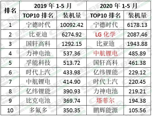 盡管受疫情沖擊,也有一些企業(yè)仍然表現非常搶眼,整體裝機量不僅沒有下降,還大幅增長,甚至躋身TOP10。LG化學基本不用解釋大家也清楚,在特斯拉(上海)Model 3的加持下,把比亞迪從多年“老二”的位置上擠下來,并且很有可能長期占據國內第二的位置。此外,中航鋰電、塔菲爾、萬向一二三等也在前5月表現亮眼,裝機和排名均大幅增長。