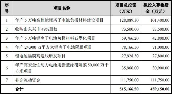 日前,璞泰來發(fā)布公告擬募集資金不超過45.9億元,扣除發(fā)行費用后將投資于年產(chǎn)5萬噸高性能鋰離子電池負極材料建設(shè)項目、收購山東興豐49%股權(quán)、年產(chǎn)5萬噸鋰離子電池負極材料石墨化項目、年產(chǎn)24,900萬平方米鋰離子電池隔膜項目、鋰電池隔膜高速線研發(fā)項目、年產(chǎn)高安全性動力電池用新型涂覆隔膜50,000萬平方米項目和補充流動資金。