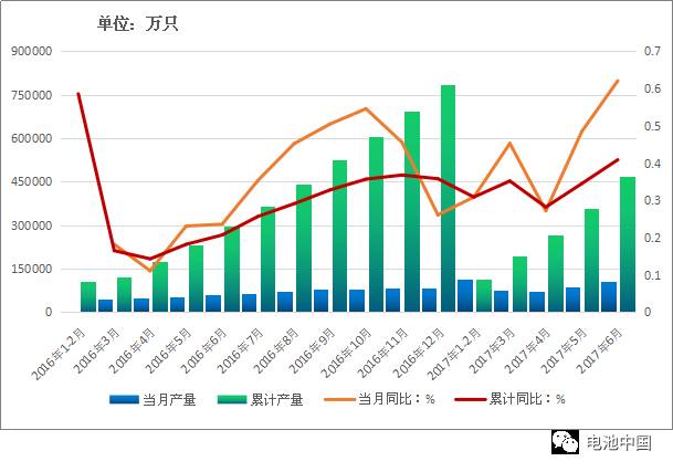 據國家統計局最新公布數據顯示,2017年6月,全國鋰離子電池產量為105986.9萬只,同比增長77.02%;1-6月累計完成產量為468348.8萬只,同比增長57.37%。