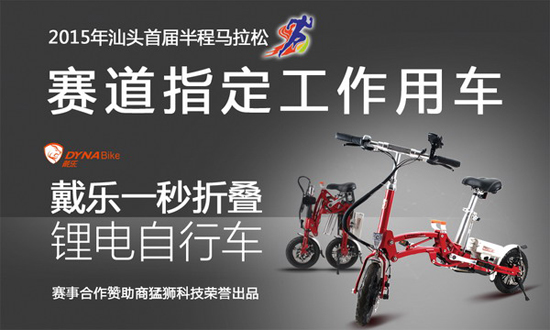 由汕頭華僑經濟文化合作試驗區、汕頭市體育局聯合主辦,汕頭市長跑協會承辦的“2015年汕頭首屆半程馬拉松賽” 將于12月13日舉行。作為賽事合作贊助商的猛獅科技,旗下戴樂一秒折疊鋰電自行車成為“賽道指定工作用車”。