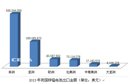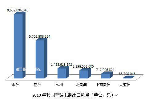 據(jù)中國(guó)化學(xué)與物理電源行業(yè)協(xié)會(huì)發(fā)布的《2013年我國(guó)電池產(chǎn)業(yè)出口數(shù)據(jù)》,2013年,我國(guó)鋅錳電池出口量為188.39億只,2012年出口量為186.49億只,出口量同比增長(zhǎng)1.01%。2013年鋅錳電池出口額為10.17億美元,2012年出口額為10.27億美元,同比減少0.97%。其中,出口非洲金額同比增長(zhǎng)7.4%,出口亞洲同比減少15.9%。出口歐洲同比減少4.4%,出口北美同比增長(zhǎng)8.2%。