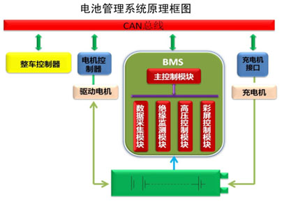參照電池管理系統(tǒng)(BMS)原理框圖,中間綠色部分是BMS主控制模塊,包括數(shù)據(jù)采集模塊,絕緣檢測模塊,高壓控制模塊,彩屏控制模塊。中控制模塊只是一個檢測單元,并不等同于BMS。完整的BMS所起的作用包括與整車控制器、電機控制器、充電機接口、驅(qū)動電機、充電機相結(jié)合。