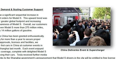 上個月,特斯拉在中國完成了首次交車。中國市場也成為了特斯拉未來發(fā)展的重要基石。在“致股東信”上,馬斯克本人在北京交車的圖片被放在了第一頁的顯著位置上。在問答環(huán)節(jié)中,馬斯克表示中國人對特斯拉的熱情超出了他的預(yù)期,全社會各個層面都對特斯拉顯示出了極大的興趣,馬斯克也對特斯拉在中國的發(fā)展充滿信心。不過他也意識到,現(xiàn)在急需解決的問題不是市場需求,而是如何減少車主的等待時間。目前特斯拉的周產(chǎn)量約為700輛。到2014年底,特斯拉希望將產(chǎn)能提升至1000輛/周。另外,今年特斯拉將著重渠道建設(shè)。到2014年底,特斯拉計劃將門店及服務(wù)中心的數(shù)量同比提高75%。