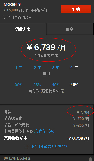 6月3日,特斯拉在其官網公布Model S分期購車方案。根據官網顯示,依據最少月供方案,購買特斯拉Model S 60千瓦時版本,每月只需還款7425元。