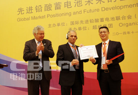 峰會上傳來了捷報,超威集團加入了國際先進鉛酸蓄電池聯合會,成為該聯合會的第十家中國成員單位。國際先進鉛酸蓄電池聯合會主席David Wilson(戴維•威爾森)向超威集團董事長周明明頒發了成員單位牌匾。