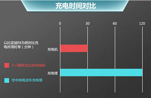 在“空中純電動車充電塔”每個車位都配有一個40KVA的快速充電設施,可以在兩個小時內把一臺比亞迪E6充滿,整個充電塔的配置總功率為14400kW。“3+3循環式立體充電機”不僅配套40KW國標、美標、歐標充電槍,還同時兼容多種充電標準,能夠在半個小時內把一臺比亞迪E6充滿,充電效率高。