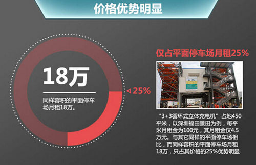 “3+3循環式立體充電機”占地450平米,以深圳福田景田為例,每平米月租金為100元,其月租金僅4.5萬元,與其它同樣的平面停車場相比,而同樣容積的平面停車場月租18萬,只占其價格的25%,優勢明顯。
