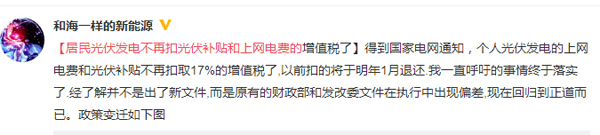 報(bào)道“中國(guó)自建光伏電站第一人”任凱通過微博透露:“得到國(guó)家電網(wǎng)北京順義供電公司通知,個(gè)人光伏發(fā)電的上網(wǎng)電費(fèi)和光伏補(bǔ)貼不再扣取17%的增值稅,以前扣的將于明年1月退還。”同時(shí)記者了解到,上海松江一光伏電站業(yè)主12月29日已經(jīng)拿到了下半年光伏發(fā)電的國(guó)家補(bǔ)貼,而且從這個(gè)月起國(guó)家0.42元/度的補(bǔ)貼將不再扣除17%的增值稅,之前扣除的也已經(jīng)返還給她。此后,售電部分也將不再扣增值稅。但是地方補(bǔ)貼部分是否會(huì)扣除增值稅還需要地方細(xì)則。