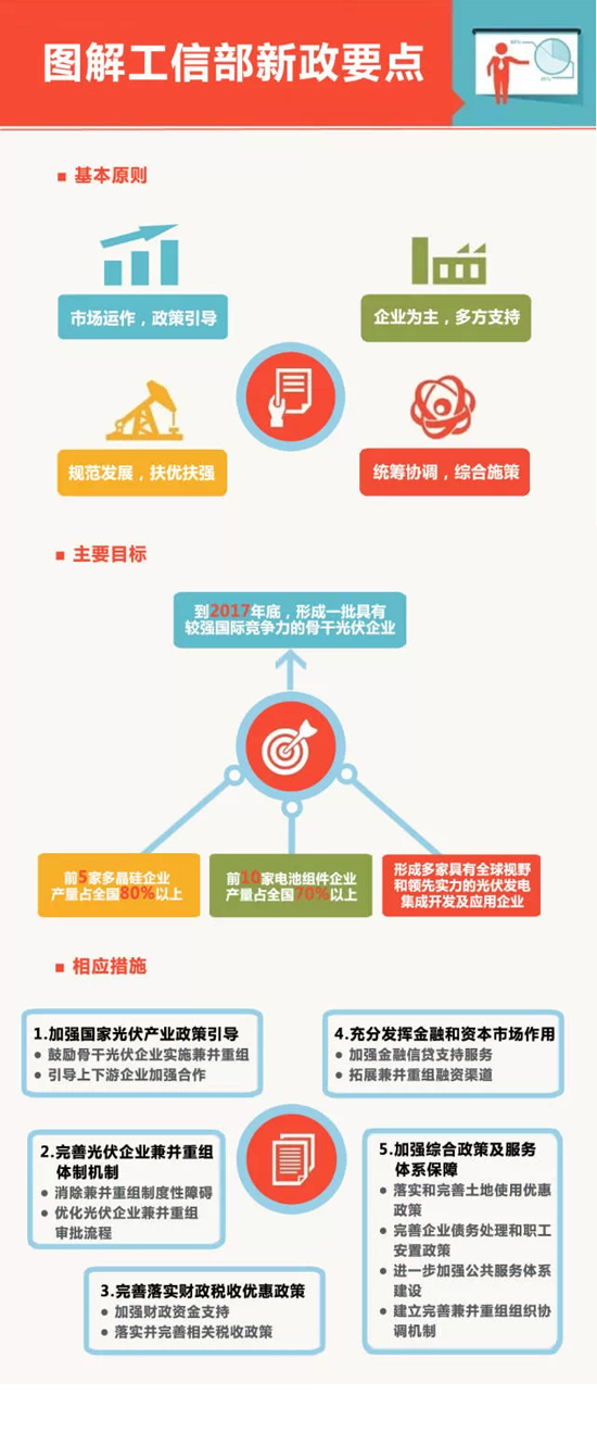 原文件略長,小編十分貼心的想到大家都是無耐心星人,所以特制了一張圖來分解意見中的要點。小伙伴們看下圖即可輕松讀懂長篇政策。有耐心的小伙伴兒請戳此鏈接查看新政全文:《工信部關于進一步優化光伏企業兼并重組市場環境的意見》。