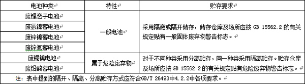 8.2.2 批量廢舊蓄電池的貯存設(shè)施應(yīng)參照GB 18597的有關(guān)要求進行建設(shè)和管理;廢鉛酸蓄電池的儲存設(shè)施還應(yīng)符合GB/T 26493中4.2.3.7中的相應(yīng)要求。