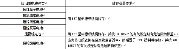 8.2.1 各類廢舊蓄電池應(yīng)根據(jù)廢電池特性采用相應(yīng)的儲存容器,并符合表2中規(guī)定的相關(guān)要求。且凡漏液的廢舊蓄電池必須放置在耐酸/耐堿的容器內(nèi),電池廢料可用塑料槽或鐵桶儲存。