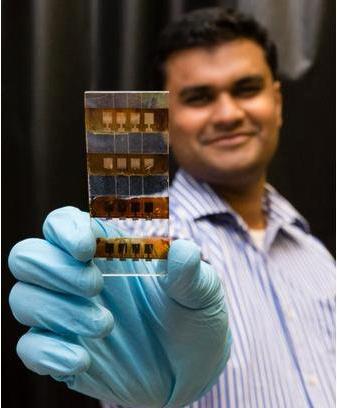 新型固態(tài)太陽能電池是一塊由5層材料組成的“三明治”,每一層都具有獨特的作用。第一層導電的玻璃,使太陽光能進入電池;第二層是沉積在玻璃層之上的二氧化鈦,這兩層合在一起作為太陽能電池前部的導電觸點;接下來就是新款太陽能電池的“主角”錫鈣鈦礦,這一層的主要作用是捕獲太陽光。研究人員在一個充滿氮氣的手套式操作箱內(nèi)制造這一材料,這種工作臺化學方法的目的是保護環(huán)境,避免錫鈣鈦礦被氧化。