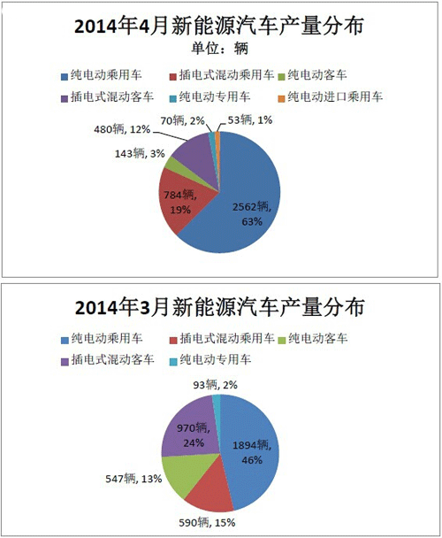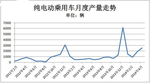 2014年4月,全國車企生產(chǎn)純電動乘用車2562輛,環(huán)比增長35.27%,同比更是高增超過3倍,增幅為359.14%。產(chǎn)量排名前三的上海華普、奇瑞、眾泰,旗下高產(chǎn)量的電動汽車都帶有微型電動車的基因,比亞迪、江淮等高速電動車品牌,市場銷售還未大規(guī)模啟動。另外,插電式混動乘用車增長較快,4月產(chǎn)出784輛,環(huán)比增加三成。