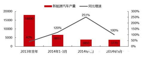 根據(jù)中國汽車工業(yè)協(xié)會的數(shù)據(jù),2013年國內(nèi)共銷售新能源汽車約1.8萬輛,同比增長超過40%,全年銷量已經(jīng)超過2009年至2012年新能源汽車累計銷量。而2014年以來,我國新能源汽車產(chǎn)銷量繼續(xù)提速,一季度生產(chǎn)新能源汽車6651輛,同比增長120%,4月份產(chǎn)量3850輛,同比增長251%,5月份產(chǎn)量3770量,同比增長接近100%。1-5月份我國新能源汽車產(chǎn)量合計為1.4萬輛,已經(jīng)接近2013年全年產(chǎn)量。