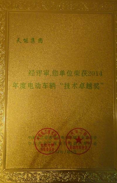 天能集團(tuán)憑借電池的優(yōu)越性能喜獲“2014年度電動(dòng)車輛技術(shù)卓越獎(jiǎng)”