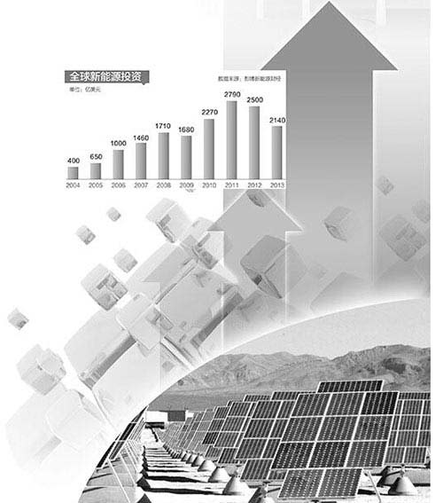 新能源投資的大幅度增加是全球新能源裝機規(guī)模快速攀升的直接驅(qū)動力。近10年來,全球主要國家出于可持續(xù)發(fā)展和保障能源供給安全的考慮,均將大力發(fā)展新能源納入國家發(fā)展戰(zhàn)略。尤其是2008年國際金融危機以來,大力發(fā)展新能源成為世界主要經(jīng)濟體應(yīng)對危機的重要舉措和手段。在此背景之下,截至2011年,全球新能源投資達(dá)2790億美元,是2004年的近7倍。根據(jù)國際能源署近期發(fā)布的《世界能源投資展望2014》,至2035年,全球近10萬億美元的發(fā)電投資中,可再生能源將占6萬億美元。