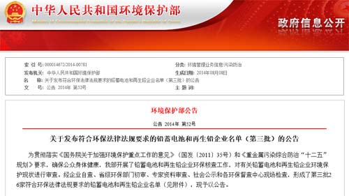 為進(jìn)一步提升企業(yè)污染防治水平,我部將持續(xù)開(kāi)展鉛蓄電池和再生鉛企業(yè)環(huán)保核查工作,發(fā)布符合環(huán)保法律法規(guī)要求的鉛蓄電池和再生鉛企業(yè)名單,并對(duì)已公告的鉛蓄電池和再生鉛企業(yè)進(jìn)行復(fù)核和抽查,發(fā)現(xiàn)不符合環(huán)保法律法規(guī)要求的,將撤銷并予以公告。