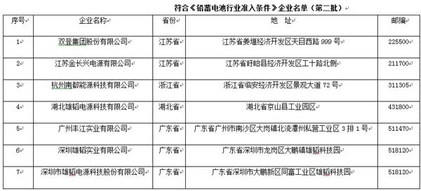 符合《鉛蓄電池行業(yè)準入條件》企業(yè)名單(第二批)