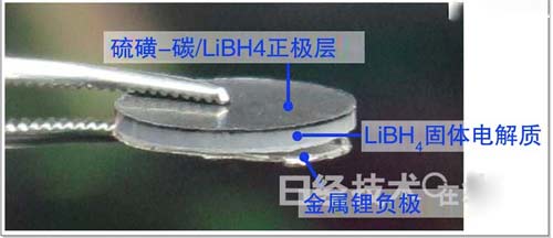 圖1:新開發的全固體Li-S電池的照片。為了便于看清電池的構成,特意將金屬Li負極的一部分剝離。