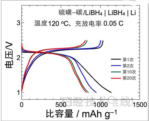 日本東北大學的研究小組著眼于絡合氫化物作為電池用固體電解質的功能性,開發出了基于絡合氫化物的新型固體電解質。絡合氫化物LiBH4在120℃下顯示出了高達2×10-3S/cm的鋰離子傳導率。通過此次研究,該研究小組成功把LiBH4配備到了電池中。經證實,開發出的全固體Li-S電池反復充放電45次后,蓄電性能也未顯著降低,S正極的單位重量能量密度達到1410Wh·kg-1以上,與以前使用的正極材料相比,能夠以2~3倍以上的高能量密度穩定工作。
