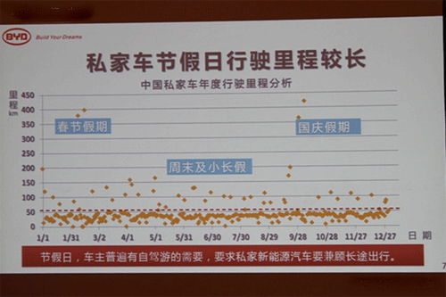 比亞迪傳統(tǒng)汽油車的保有量差不多接近兩百萬臺(tái),根據(jù)這些汽車的統(tǒng)計(jì)數(shù)據(jù)也能測(cè)算出來,作為私家車來說,行使的里程從1月份到12月份,大部分集中在50公里以下,春節(jié)的時(shí)候可能會(huì)高一點(diǎn)。周末或者小長假,或者國慶假期高一點(diǎn)。絕大多數(shù)都是在50公里以下,王傳福還給記者展示了統(tǒng)計(jì)數(shù)據(jù)的星狀分布圖。