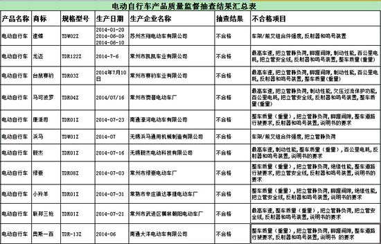 在抽查和監測總體情況方面,本次共抽查我省生產企業的電動自行車215批次,小羚羊、速蝶、龍邁等11批次不合格,合格率為94.9%;江蘇省生產的蓄電池41批次,合格率為100%;抽查充電器23批次,合格20批次,合格率為87%。