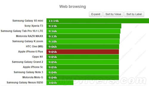 另外gsmarena表示在其大屏智能手機續航數據庫中,iPhone 6 Plus的續航表現可以排名前十。