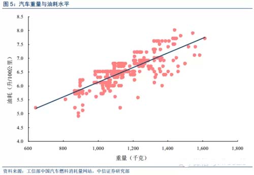 汽車輕量化對燃油效率提升的貢獻明顯。據工信部的油耗公告,按照不同車輛綜合工況的油耗水平擬合結果為:汽車重量每降低100千克,可節約百公里油耗約0.28升。在實際使用中,相關研究顯示:若汽車整車重量降低10%,燃油效率可提高6%-8%,減少二氧化碳排放約50克/公里;汽車整備質量每減少100千克,百公里油耗可降低0.3-0.6升。