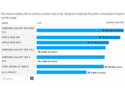 這項測試由phonearena進行,用相同標準測試6款設備,三星GALAXY NotePRO 12.2續航時間8小時58分鐘,排在首位。iPad Air續航時間8小時38分鐘,iPad Air 2僅7小時27分鐘。