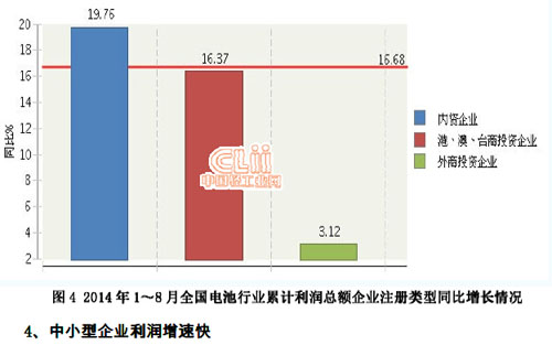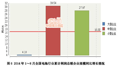 2014年1~8月,全國電池行業累計完成利潤總額同比增長16.68%。其中:8月份完成利潤總額12.86億元,同比下降6.75%。