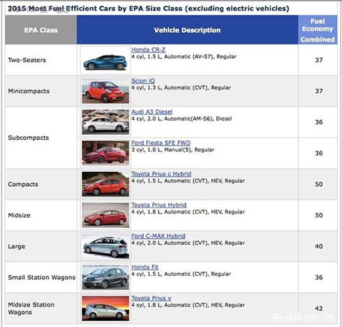當(dāng)然電動車在國內(nèi)畢竟還很少,而且電動車和普通車比能效,似乎有點(diǎn)勝之不武,那么如果不帶電動車,結(jié)果又如何呢?EPA也同時公開了另一個不包括EV在內(nèi)的最省油車型榜。