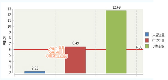 從企業(yè)規(guī)模看,小型企業(yè)增長速度加快。大型企業(yè)完成累計主營業(yè)務(wù)收入占41.14%,同比增長2.22%;中型企業(yè)完成累計主營業(yè)務(wù)收入占35.54%,同比增長6.49%;小型企業(yè)完成累計主營業(yè)務(wù)收入占23.32%,同比增長12.69%。(參見圖5、圖6)