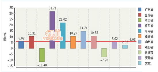 圖10 2014年1~9月全國電池行業(yè)累計主營業(yè)務收入主要地區(qū)同比增長情況