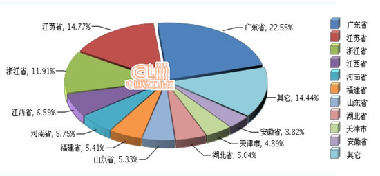 2014 年1~9 月全國電池行業(yè)主營業(yè)務收入較高的產區(qū)主要集中在廣東、江蘇、浙江、江西、河南、福建、山東、湖北、天津、安徽地區(qū),十個地區(qū)完成主營業(yè)務收入占全國的85.56%。(參見圖9)。