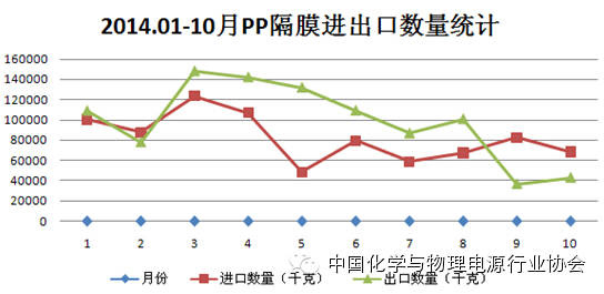2014年10月,我國進口乙烯聚合物制電池隔膜共511755千克,進口額為3314萬美元,出口數量為471587千克,出口額為226萬美元。本年度至10月累計進口乙烯聚合物制電池隔膜量為5683565千克,累計進口額為30250萬美元。累計出口乙烯聚合物制電池隔膜量為4075074千克,累計出口額為2799萬美元。