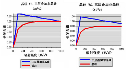 圖⑹ 25℃與60℃非晶硅與晶體硅的相對效率對比