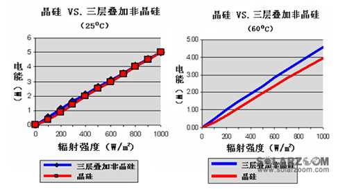 圖⑺ 25℃與60℃非晶硅與晶體硅的產(chǎn)生電能對比