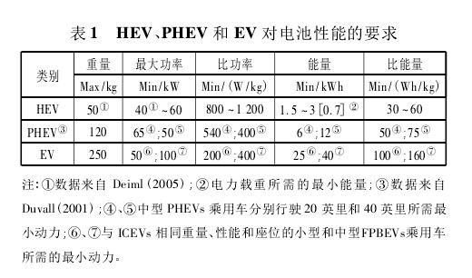 由于不同類型新能源汽車中,車用動(dòng)力電池的使用方式有較大區(qū)別,因此對于其性能要求有較大區(qū)別。HEV有汽油發(fā)動(dòng)機(jī)作為動(dòng)力來源,更強(qiáng)調(diào)加速性能和爬坡能力,因此更注重電池的比功率(要求高達(dá)800一1 200 W / kg);PHEV和EV完全以電池作為動(dòng)力,更強(qiáng)調(diào)充電后的續(xù)駛能力,因而更關(guān)注電池的比能量(要求達(dá)到100一160 Wh/kg)(見表1)。
