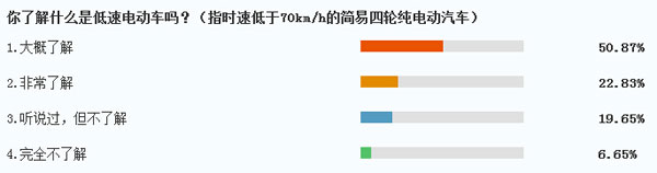 調(diào)查數(shù)據(jù)顯示,在參與網(wǎng)絡(luò)投票的人群中,有50.87%的網(wǎng)友表示對于低速電動車“大概了解”,另有22.83%的網(wǎng)友選擇“非常了解”,占比超過70%,說明低速電動車這類產(chǎn)品在市場上的確擁有很高的關(guān)注度,選擇“完全不了解”這一選項的網(wǎng)友僅占全部調(diào)查人群的6.65%。