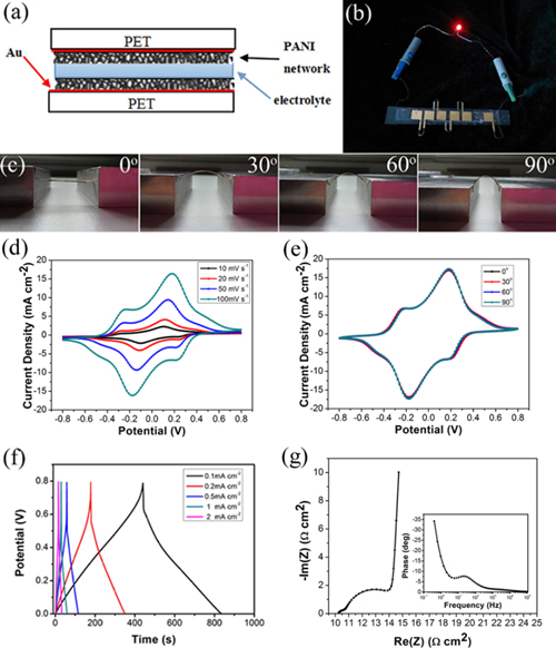 圖1 (a) 超級電容器器件構型圖;(b) 器件并聯后驅動LED燈光學照片;(c)器件在彎曲角0o,30o,60o以及90o時光學照片;(d)器件在不同掃速下的循環伏安曲線圖;(e)器件在4個彎曲角度下的循環伏安曲線;(f)器件在不同恒電流下的充放電曲線圖;(g)器件的阻抗譜圖。