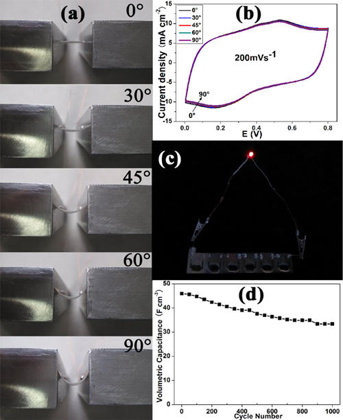 圖2 (a)器件在彎曲角0°, 30°, 45°, 60°以及90°時光學照片;(b)器件在5個彎曲角度下的循環伏安曲線圖;(c)器件并聯后驅動LED燈的光學照片;(d)器件在200mVs-1掃速下的1000次循環圖。