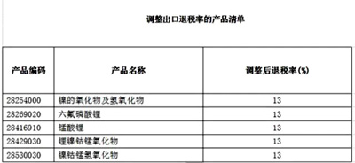 [摘要]鎳的氧化物及氫氧化物、六氟磷酸鋰、錳酸鋰、鋰鎳鈷錳氧化物、鎳鈷錳氫氧化物等電池材料調(diào)整后的出口退稅率為13%。