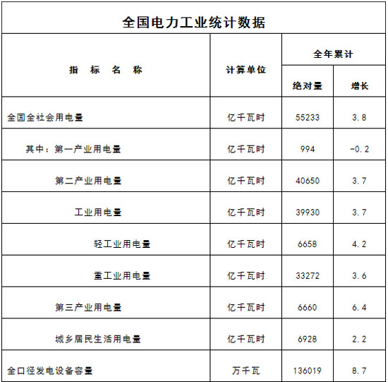 2014年,全社會用電量55233億千瓦時,同比增長3.8%。分產業看,第一產業用電量994億千瓦時,同比下降0.2%;第二產業用電量40650億千瓦時,同比增長3.7%;第三產業用電量6660億千瓦時,同比增長6.4%;城鄉居民生活用電量6928億千瓦時,同比增長2.2%。
