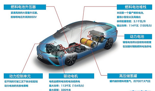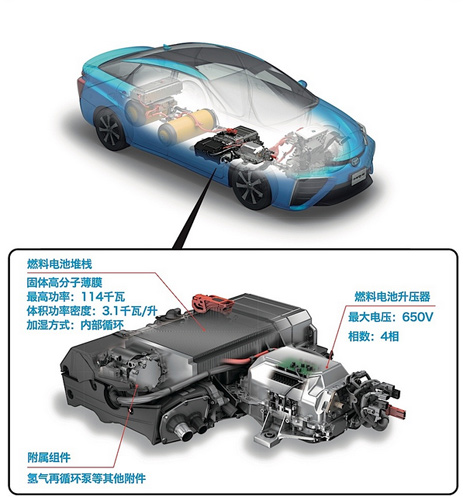 因?yàn)闅浞肿芋w積小,可以透過薄膜的微小孔洞游離到對(duì)面去,但是在穿越孔洞的過程中,電子被從分子上剝離,只留下帶正電的氫質(zhì)子通過,氫質(zhì)子被吸引到薄膜另一側(cè)的電極與氧分子結(jié)合。電解質(zhì)薄膜兩側(cè)的電極板將氫氣拆分成氫離子(正電)和電子、將氧氣拆分成氧離子(負(fù)電)和電子,電子在電極板之間形成電流,兩個(gè)氫離子和一個(gè)氧離子結(jié)合成為純水,是反應(yīng)的廢物。所以本質(zhì)來講,整個(gè)運(yùn)行過程就是發(fā)電過程。因此Mirai是純電動(dòng)車,燃料電池堆棧代替的就是厚重且充電效率低下的鋰離子電池組。